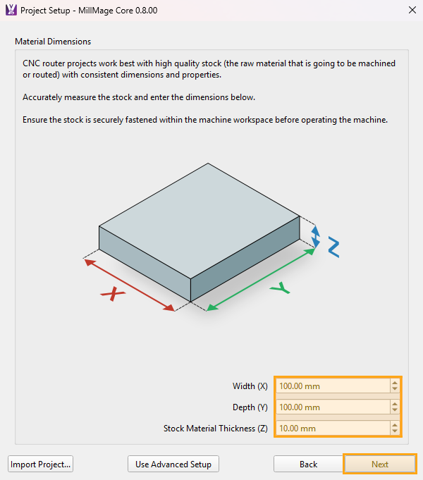 After you've set up your first device profile, you'll be greeted by the Project Setup Wizard. You'll see this window again each time you open MillMage — the parameters you enter here determine the size of your Workspace, and other important information MillMage uses to tell your CNC how to carve your project.