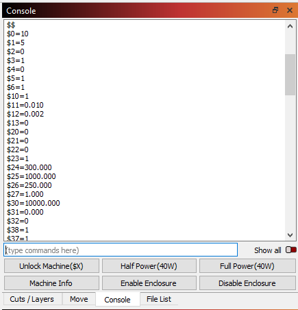 Many GRBL based machines allow the settings of the machine to be easily exported or viewed. For advanced configuration like adding limit switches, updating firmware, or setting up a new controller, you'll need to interact with these values. You can do this in MillMage by using the Console window or the Machine Settings window to copy, update, or reset your machine settings.