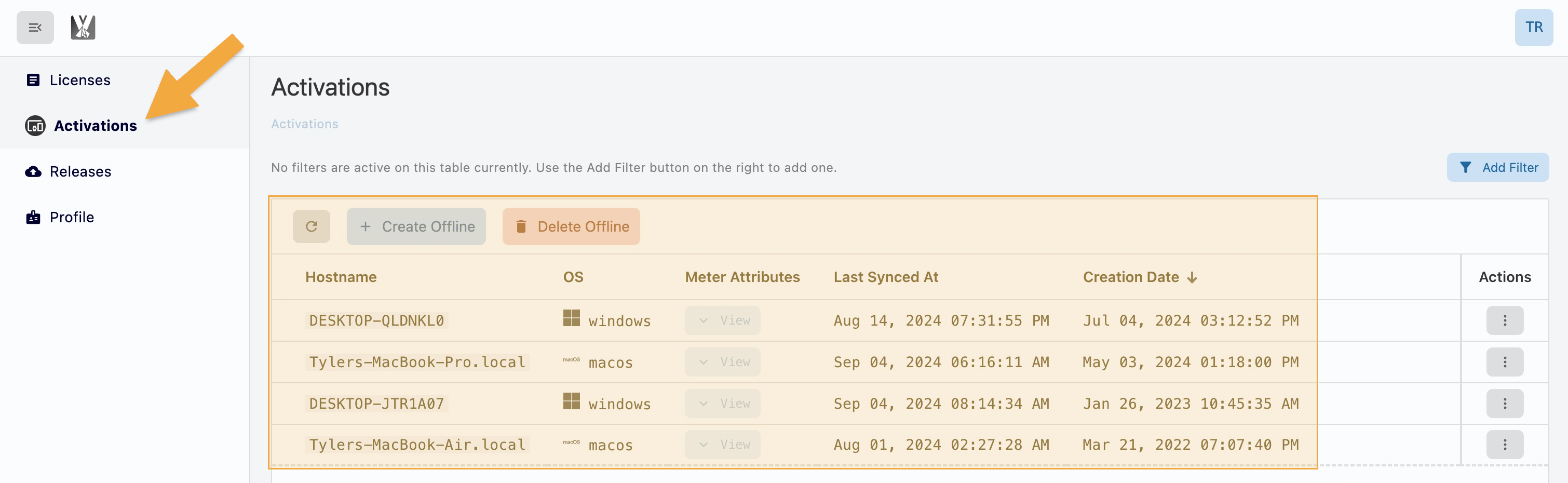 Click on Activations in the left sidebar to view a list of computers assigned to your license key, when they were last used (Last Synced At), and when they were first activated (Creation Date).
