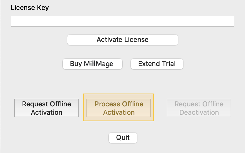 If you're not comfortable performing the above steps yourself, email us at Support@MillMagesoftware.com with the .ofr file and license key, and we will process and return the .dat response file for you to use to complete the activation.