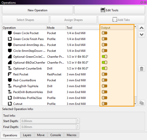 You are now ready to run the operations in your project that use the tool you installed. Check the operations listed in the Operations window and turn on related operations that match your installed tool and turn off the remaining entries that do not match. Remember to run the Tool Length Probe again after each additional tool change within your project.
