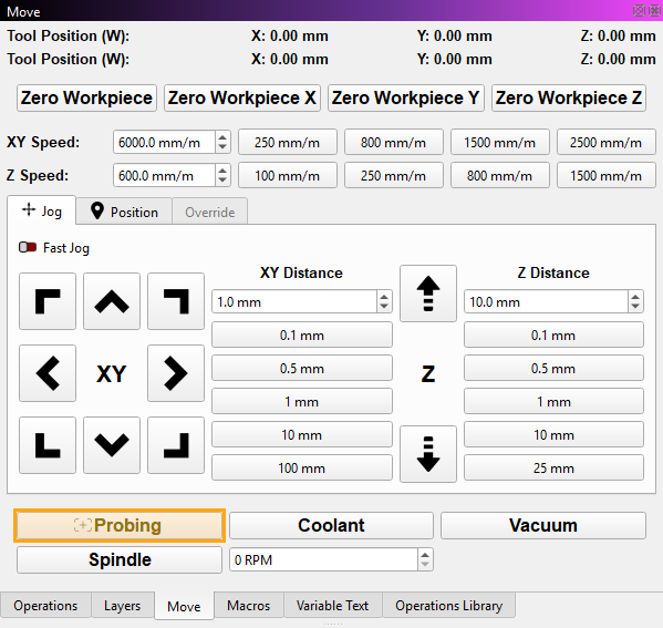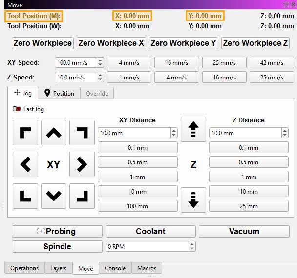 - Note the machine X and Y Axis coordinates in the Move Window, labeled Tool Position (M)