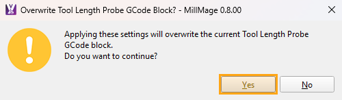 Select OK to save the settings. Select Yes if prompted, to overwrite the previous Tool Length Probe Custom GCode entry in Device Settings. The Probe Settings window will close when saved.