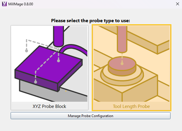 Open the Probe Configuration window to define the parameters of your tool length probe by selecting either: