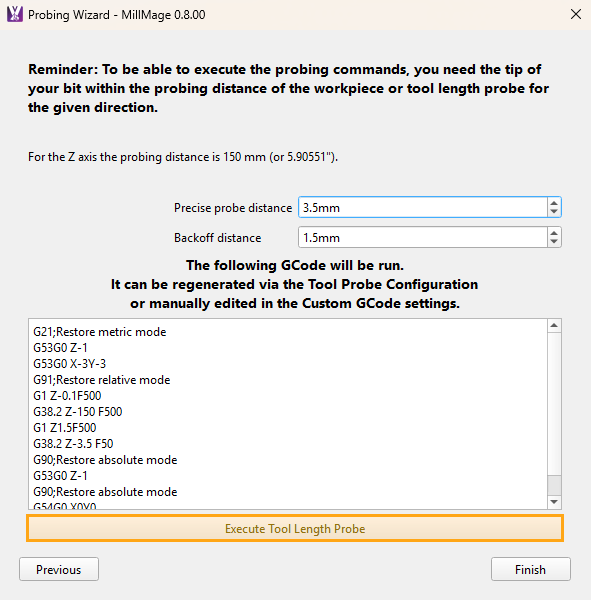 Click on Tool Length Probe to open the Tool Length Probe window.