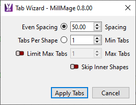 You can create tabs manually using the Add Tabs tool, or MillMage can generate them automatically using the Tab Wizard found in the Operations Window.