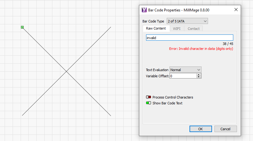 If the data you've entered is invalid for the type of Bar Code you've selected, you'll see an X in the Workspace and an error message in the Bar Code Properties window.