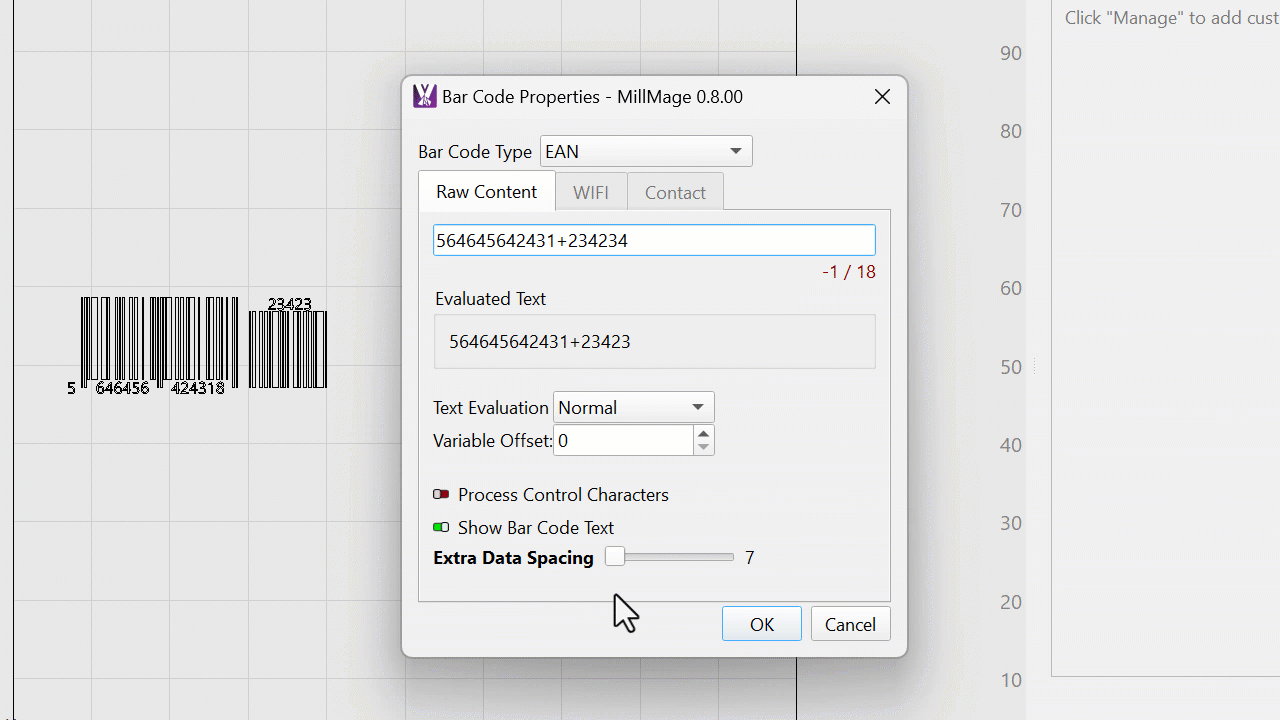 Some Bar Code Types support adding a secondary Bar Code based on extra data input after a "+" symbol. The Extra Data Spacing slider controls the distance between the primary and secondary Bar Codes.