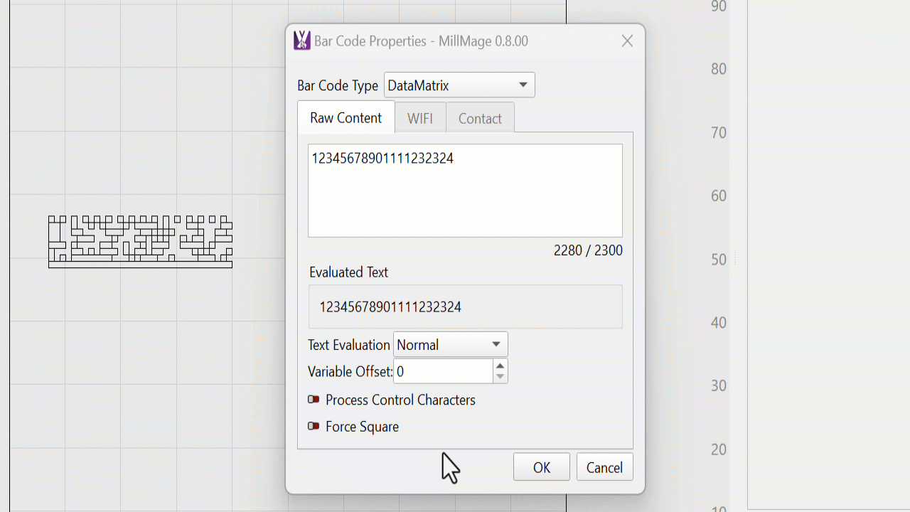 When Data Matrix is the selected format, some data inputs can result in a rectangular Bar Code. Enable Force Square to have the Data Matrix always remain square. This switch is enabled by default.