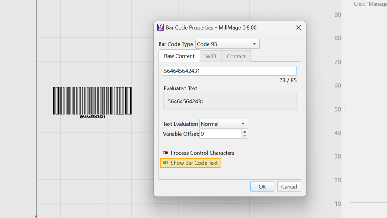 For supported Bar Code Types, tells MillMage to output the text from the Raw Content field along with the Bar Code. This switch is enabled by default.