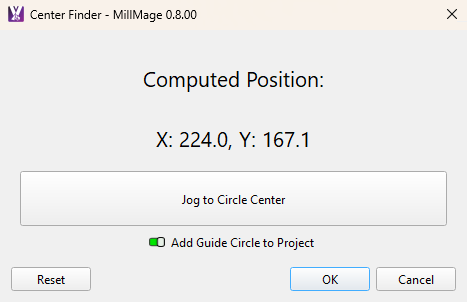 By jogging your CNC machine tool head to three positions on a circle (or other regular shape), and setting those positions in the Center Finder Wizard, MillMage can calculate the circle that passes through those three points, jog your CNC machine to its center, and create a circle in your MillMage Workspace matching those dimensions, to represent your stock.