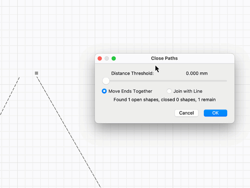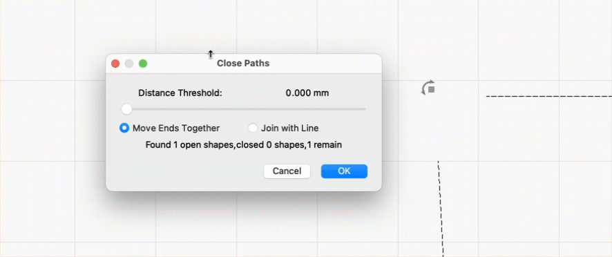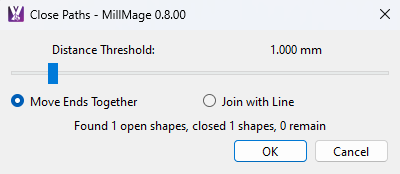 Several functions in MillMage, including Pocket and Rest Pocket Operations, require shapes that are closed loops, with start and end points that are the same. This option works similarly to Close Path to close shapes with start and end points that are not the same, while providing greater control over how far apart they must be in order to connect them, and how they will be connected.