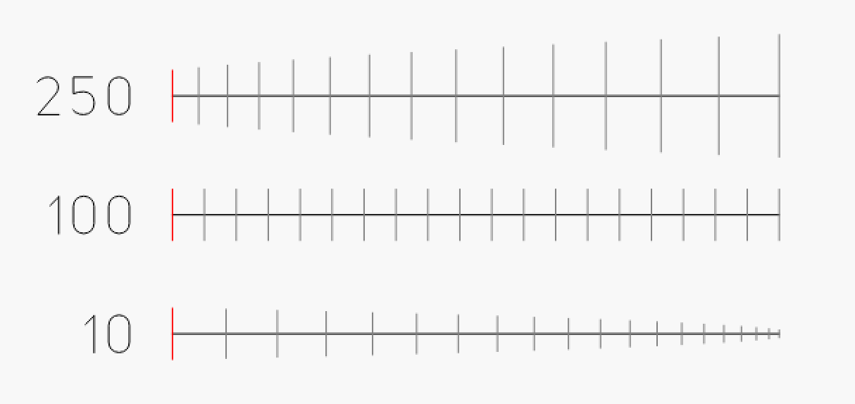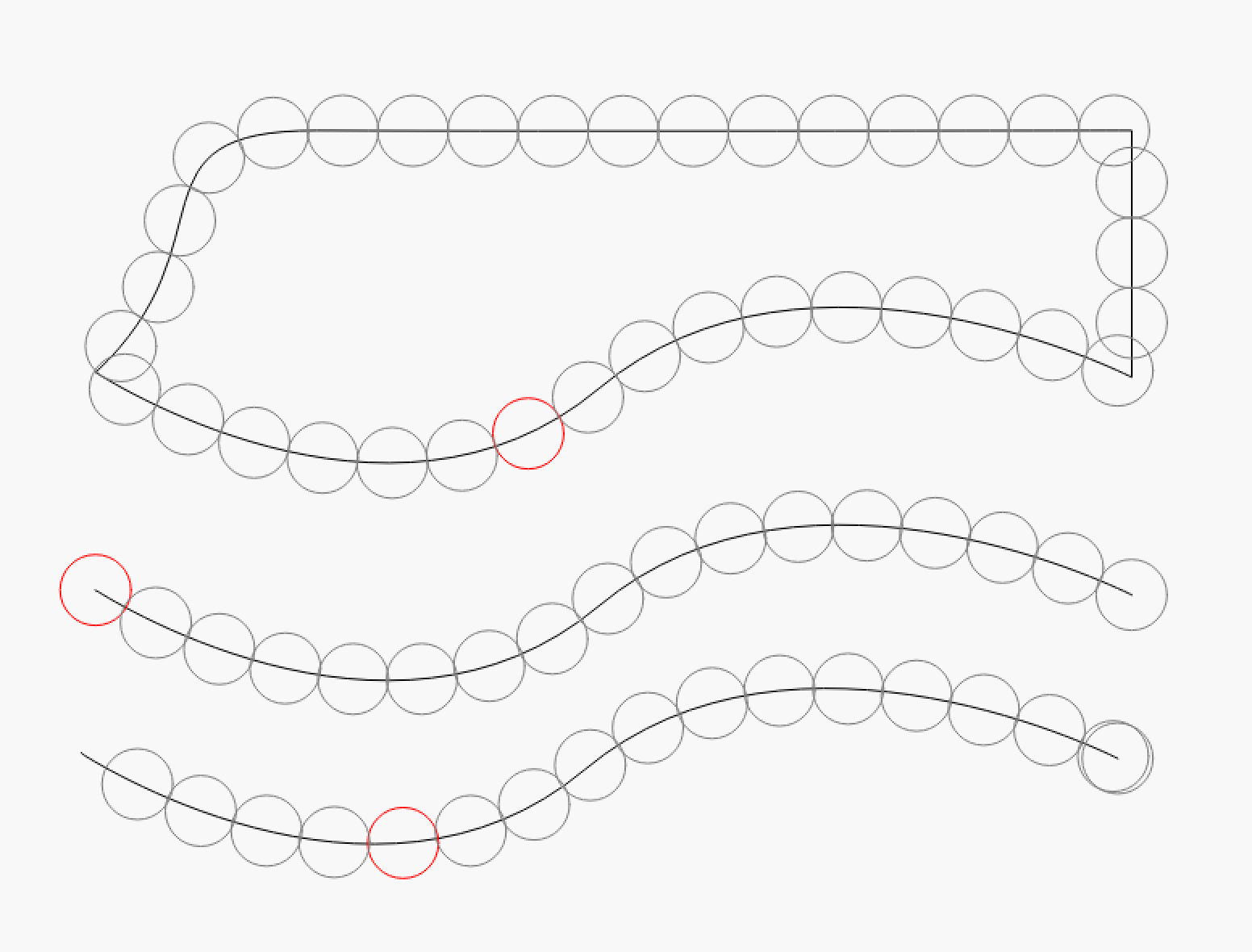 - Precisely-spaced patterns that follow a vector path, for example measurements on a curved ruler.
