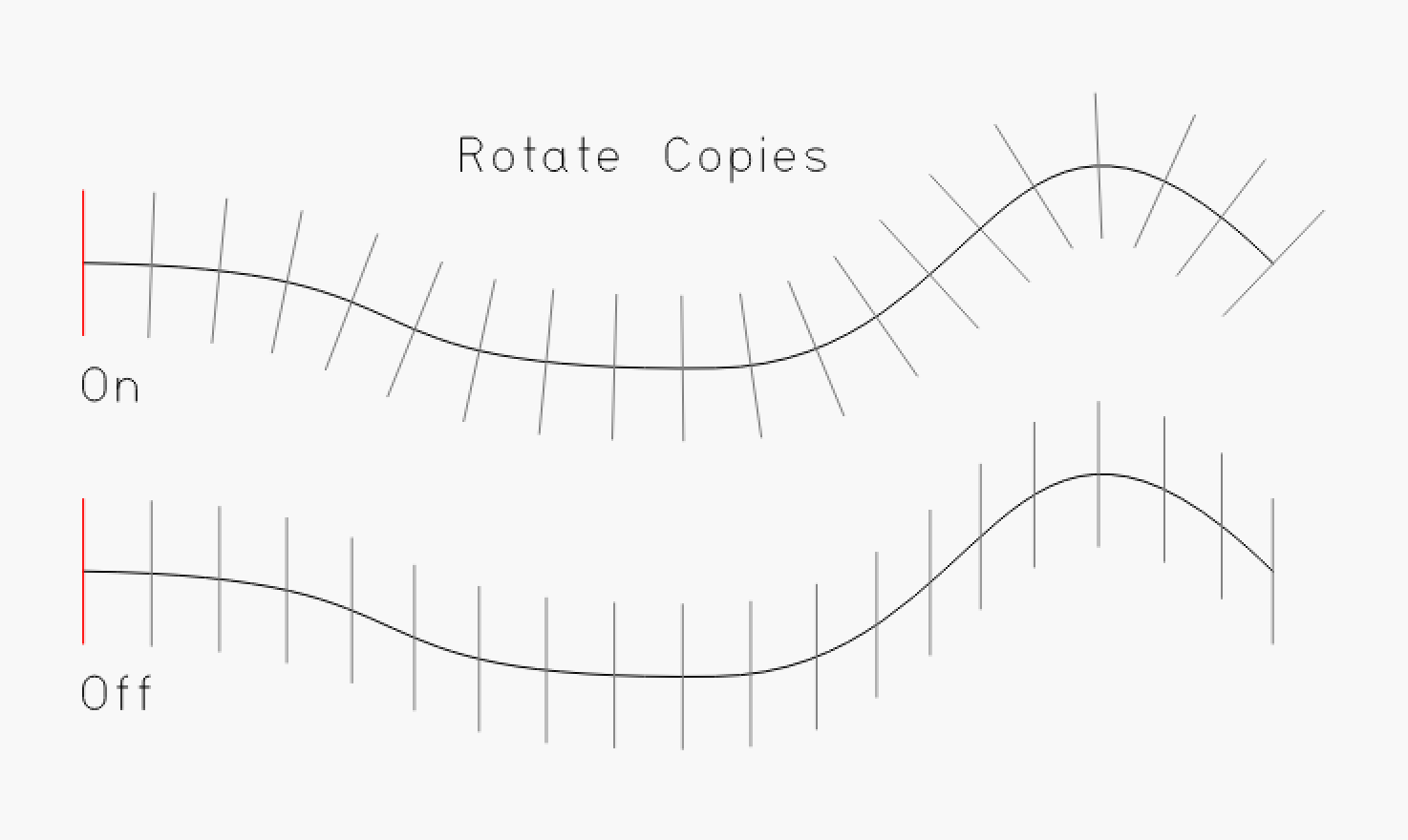 Enable Rotate Copies to create duplicates that are oriented acording to the changes in direction of the path. Disable this option to create objects that remain in the same orientation as the originally-copied object.