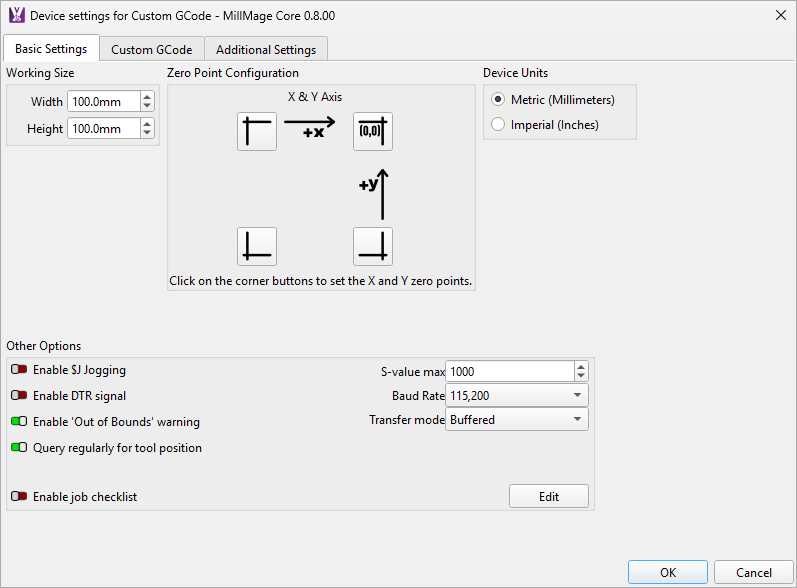 The Device Settings window contains device-specific settings for your CNC machine. The settings available change based on the device selected — not all settings described below will necessarily be shown in your instance of MillMage.