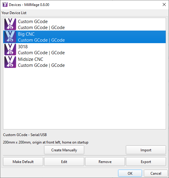 Sets the currently selected device as the default. If you have multiple devices, use this to set which device is active when MillMage launches. The current default device has an asterisk before the name.