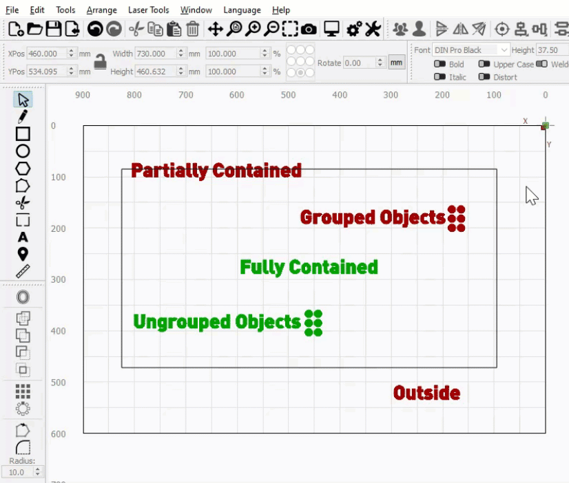 In the animation above, the objects shown in red are unaffected by Auto-Group, either because they're not fully contained within the rectangle or because they are already Grouped. The green objects are automatically Grouped with the rectangle.