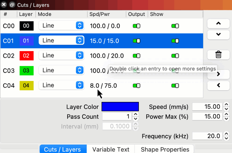 With the default settings shown in the screenshot above — Order by Layer positioned first in the list, and Order by Priority positioned second — the Cut Planner will first split all objects in your projects into lists based on the Layer they are assigned to, and will then sort the objects in each layer based on the Priority you've set for each object.