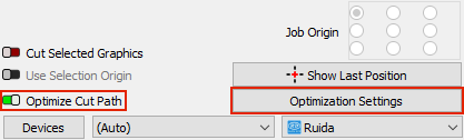 Optimization Settings only take effect when the Optimize Cut Path switch in the Laser Window is toggled on. If Optimize Cut Path is toggled off, graphics are output in the order in which they were first created.