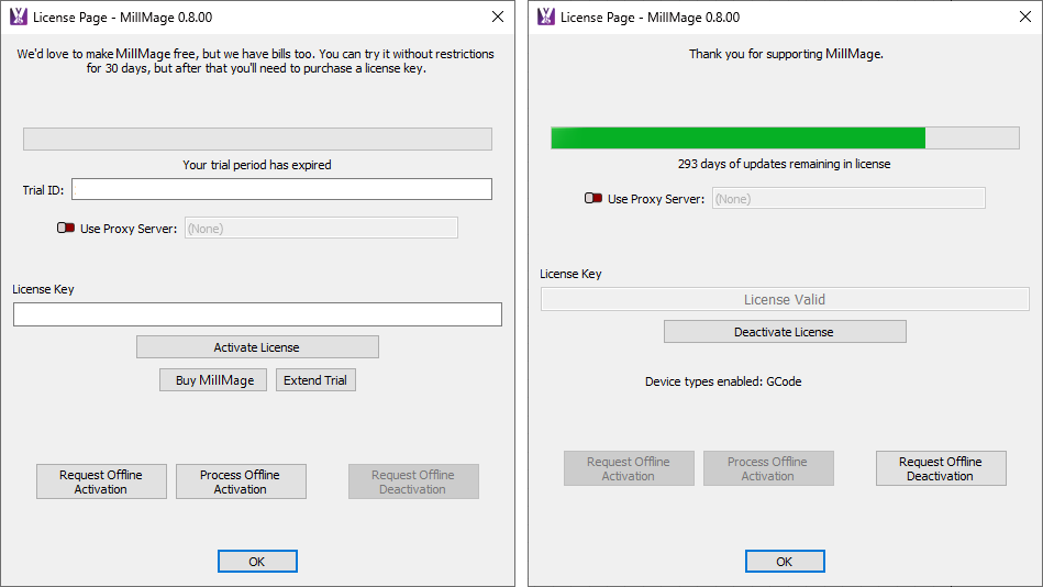 If your MillMage installation has not been activated, you'll see the License Page as soon as you open MillMage. From this page, you can: