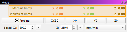You can read current Machine (M) and Work (W) coordinates at the top of the Move Window.