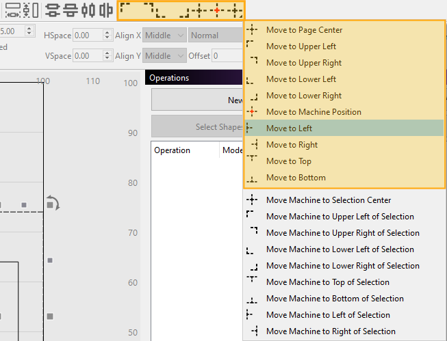 The Move Selected Objects tools move objects to a corner, midpoint, or center of your Workspace. It can also move objects to the last reported position of your machine.