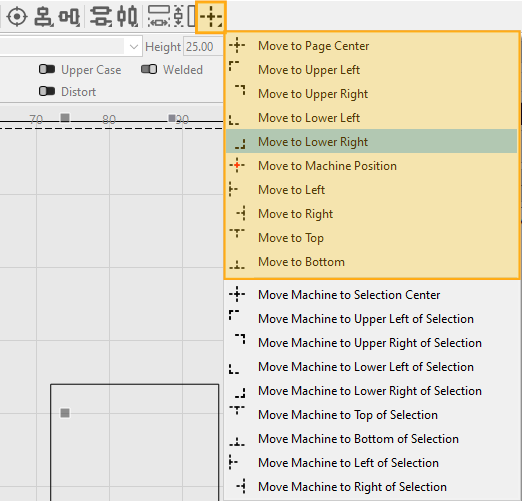In the Arrange (long) Toolbar, the options to move to the center of your Workspace, a corner of your Workspace, or the last reported position of the machine are available in the full toolbar, while other options are available in a drop-down menu.