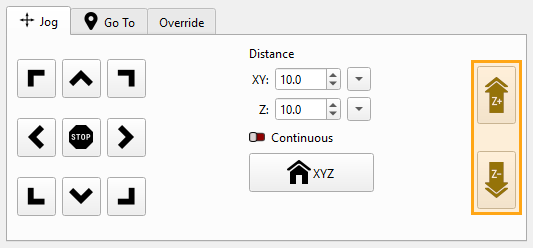 The distance controls determine how far the tool will move when jogging. Click the buttons or type in a distance to set an appropriate distance.