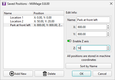 Use the Manage button to add, modify, and delete saved positions. All saved positions are stored in Machine Coordinates.
