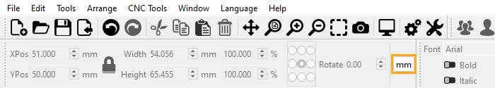 Change the project units of measure at any time by pressing the mm or in button found inbetween the Numeric Edits toolbar and the Text Tools toolbar.