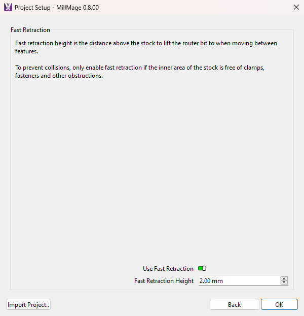 Fast retraction height is the distance above the material stock to lift the router tooling up when moving between features. This feature is on by default.