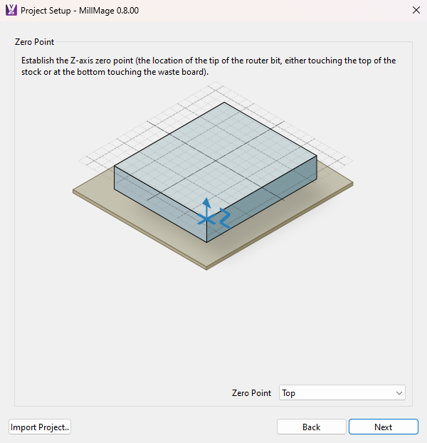The Project Setup Wizard is a step-by-step guide to set up your project by choosing your CNC machine, defining setup parameters, material dimensions, and establishing the project zero point — also known as the work offset.