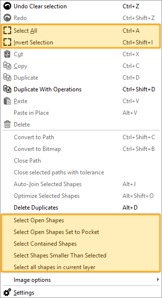 In order to modify graphics, you must first select them. The Select tool is the primary means of selecting objects, but MillMage also includes several additional options for making selections based on their open/closed state, size, operation, and more.
