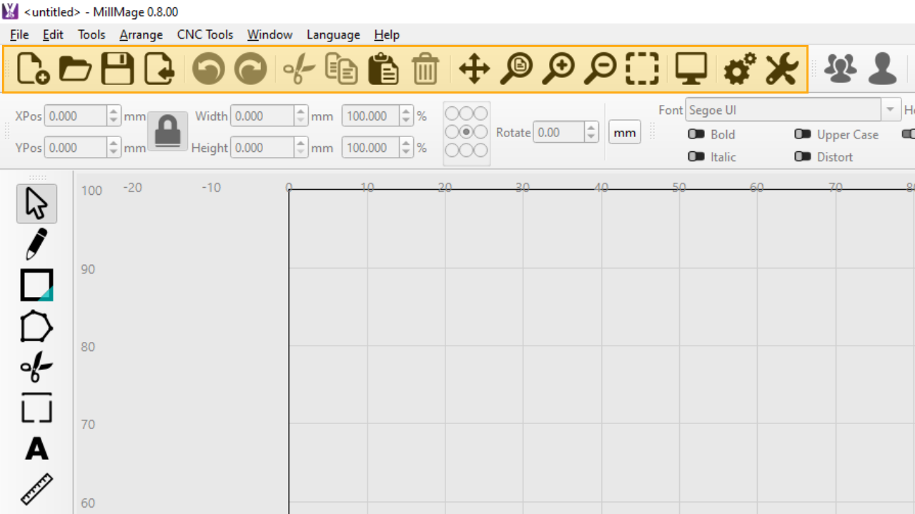 The Main Toolbar contains tools for creating, opening, and saving projects; copying, pasting, and deleting graphics; accessing your MillMage preferences and Device Settings; and more.