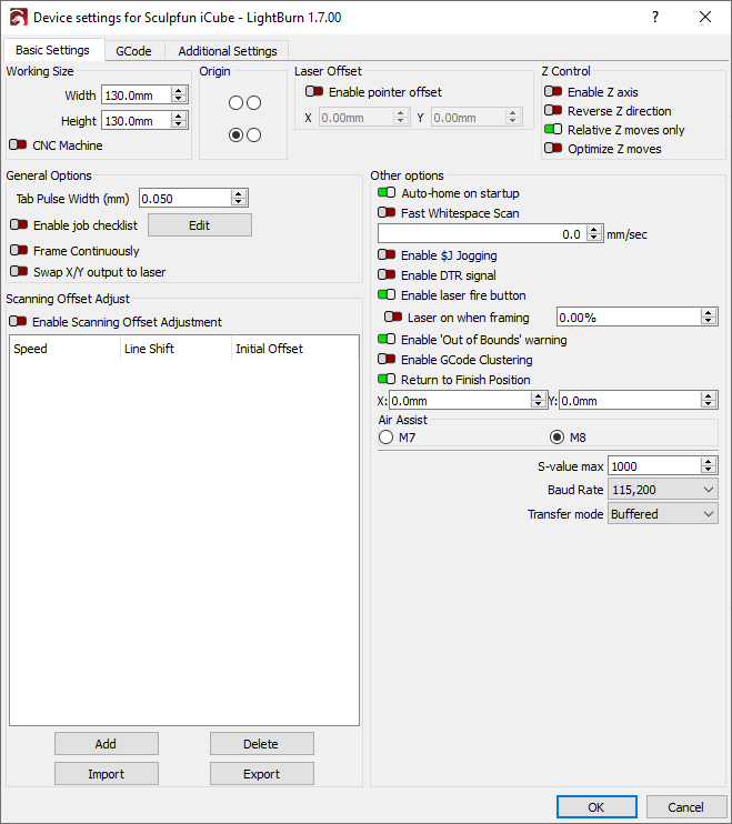 MillMage defaults to the Buffered transfer mode for communication with GRBL devices. This is faster and more reliable than the Synchronous transfer mode. However, there are a few devices that are incompatible with buffered transfer mode. These devices will stutter, stop, or even restart when buffered communication is selected. If you notice this happening, try switching the transfer mode to Synchronous.
