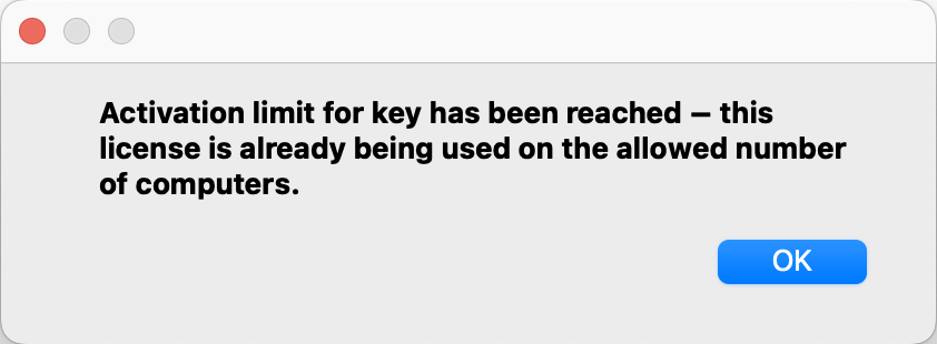 You have used up the maximum amount of simultaneously allowed activations for your key. Deactivate MillMage from an unused computer by opening MillMage on that computer and clicking Deactivate License in the License Management window, or log in to our License Management Portal to manage your activations. For full instructions on using the License Management Portal, see License Management.
