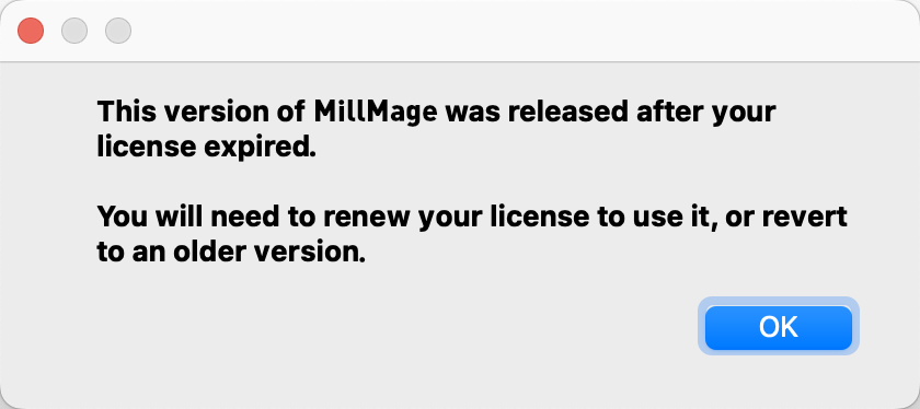 To download and revert to a version of MillMage compatible with your key, visit our release repository.