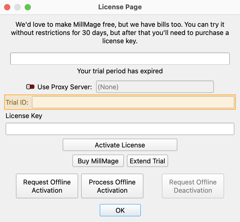 Release Candidate users who see a "Your trial period has expired" notice when opening MillMage can request an extension to the update period by emailing the MillMage Trial ID to the Support team.