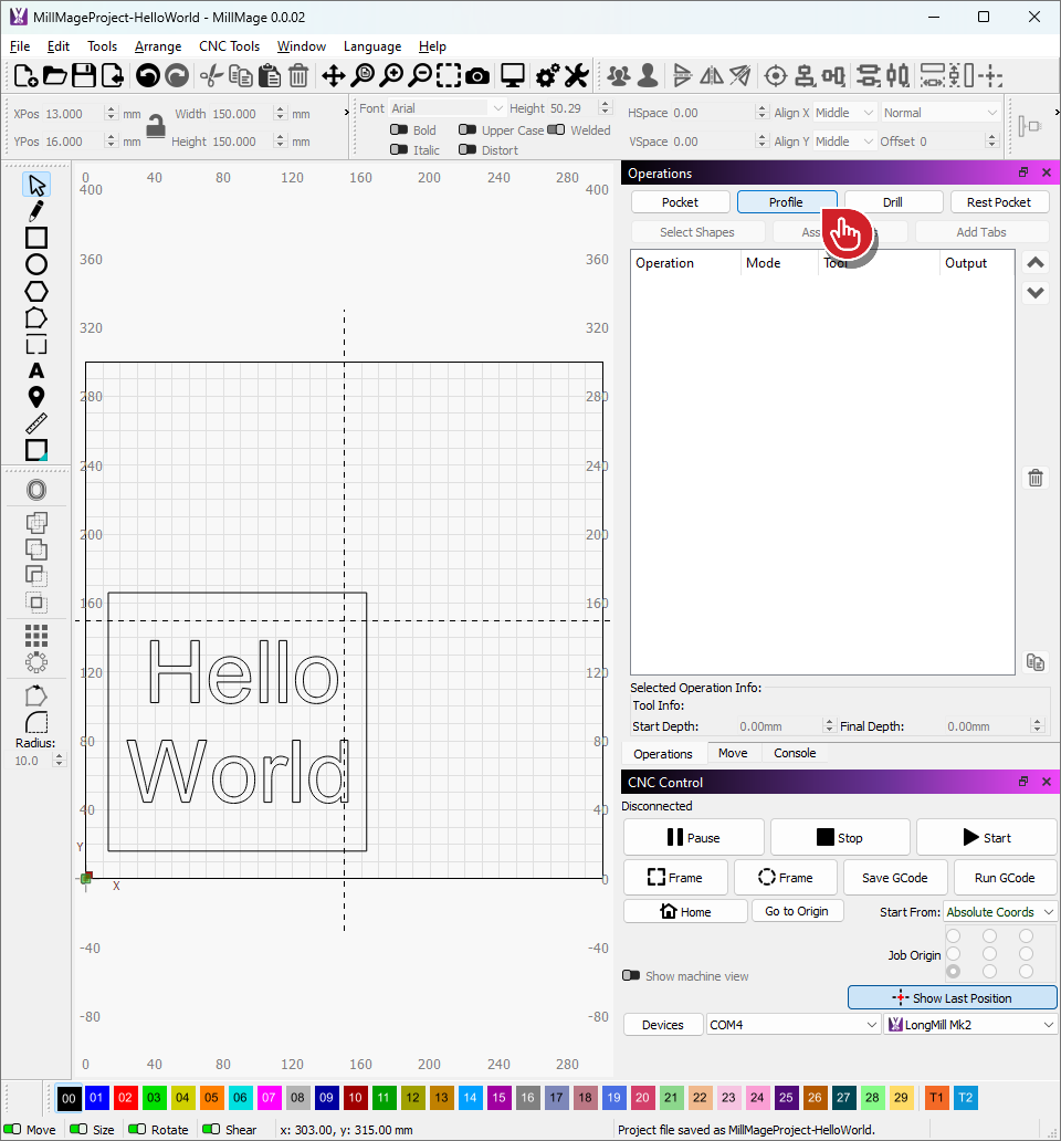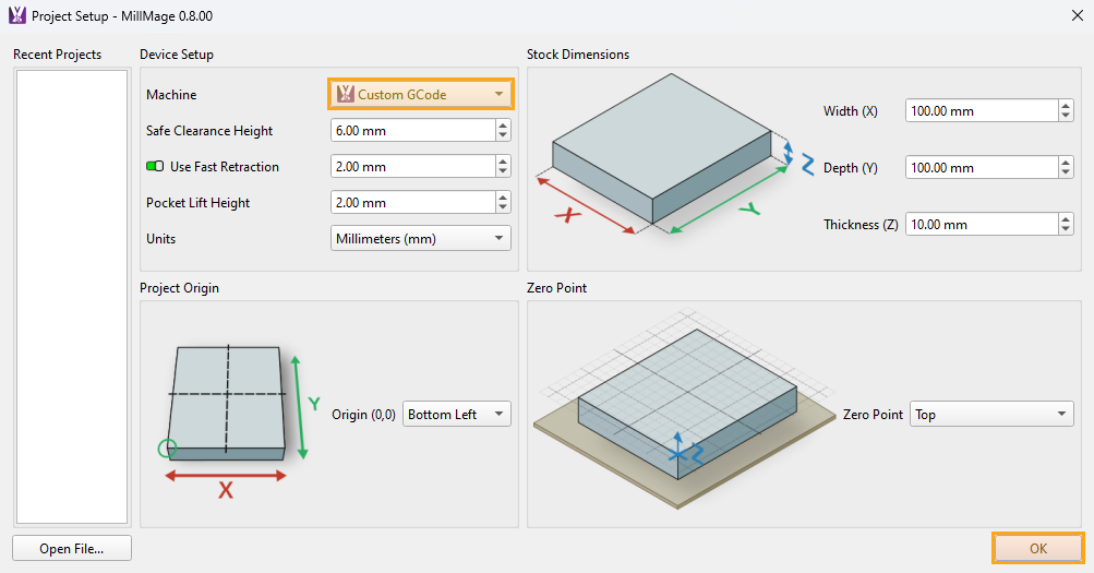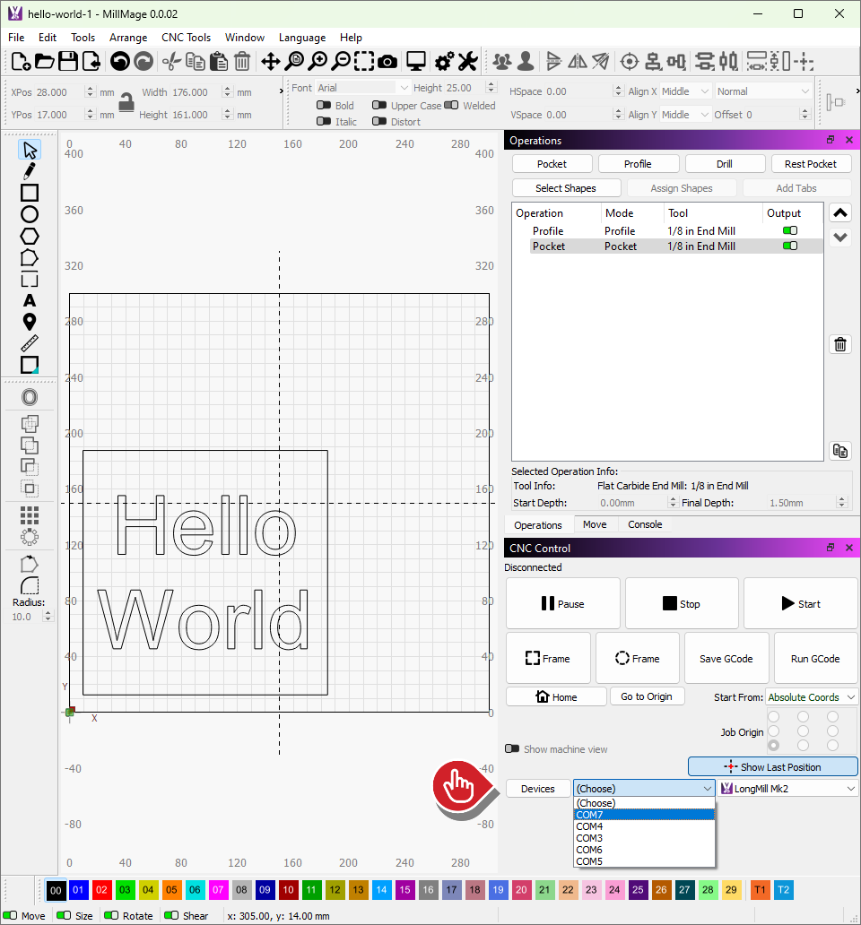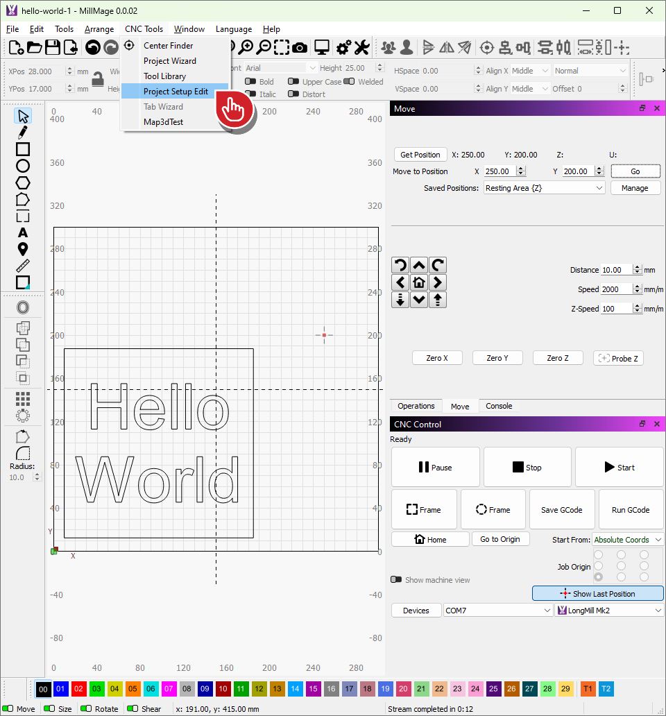 Open MillMage and select the desired CNC machine from the Machine drop down in the Project Setup Window.