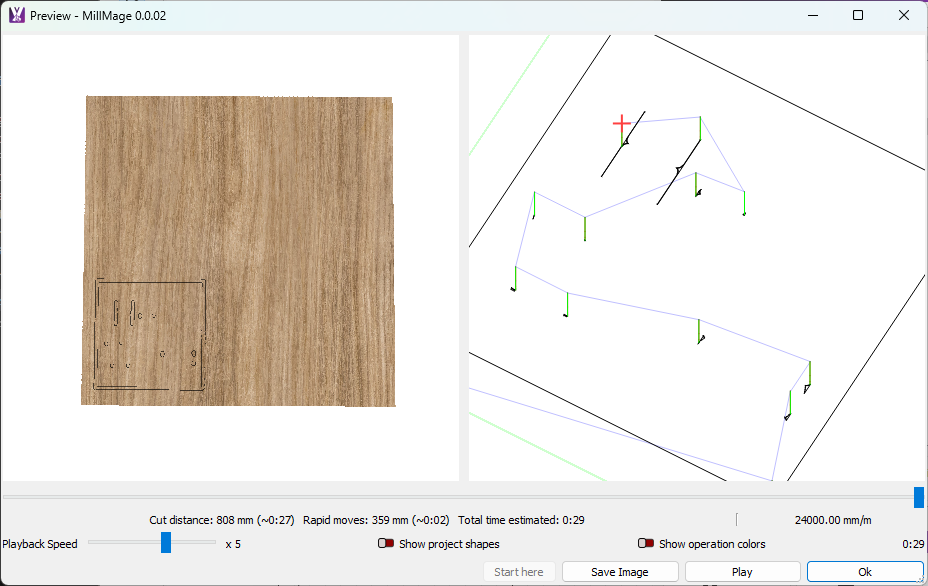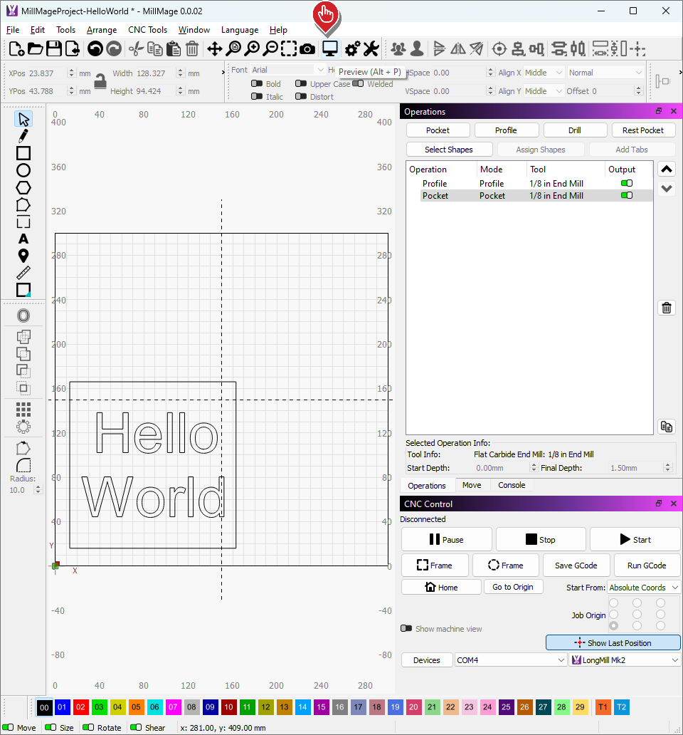 The Preview tool allows you to preview the movements and cutting path the CNC machine will take and will give an estimated time of how long the machining program will take.