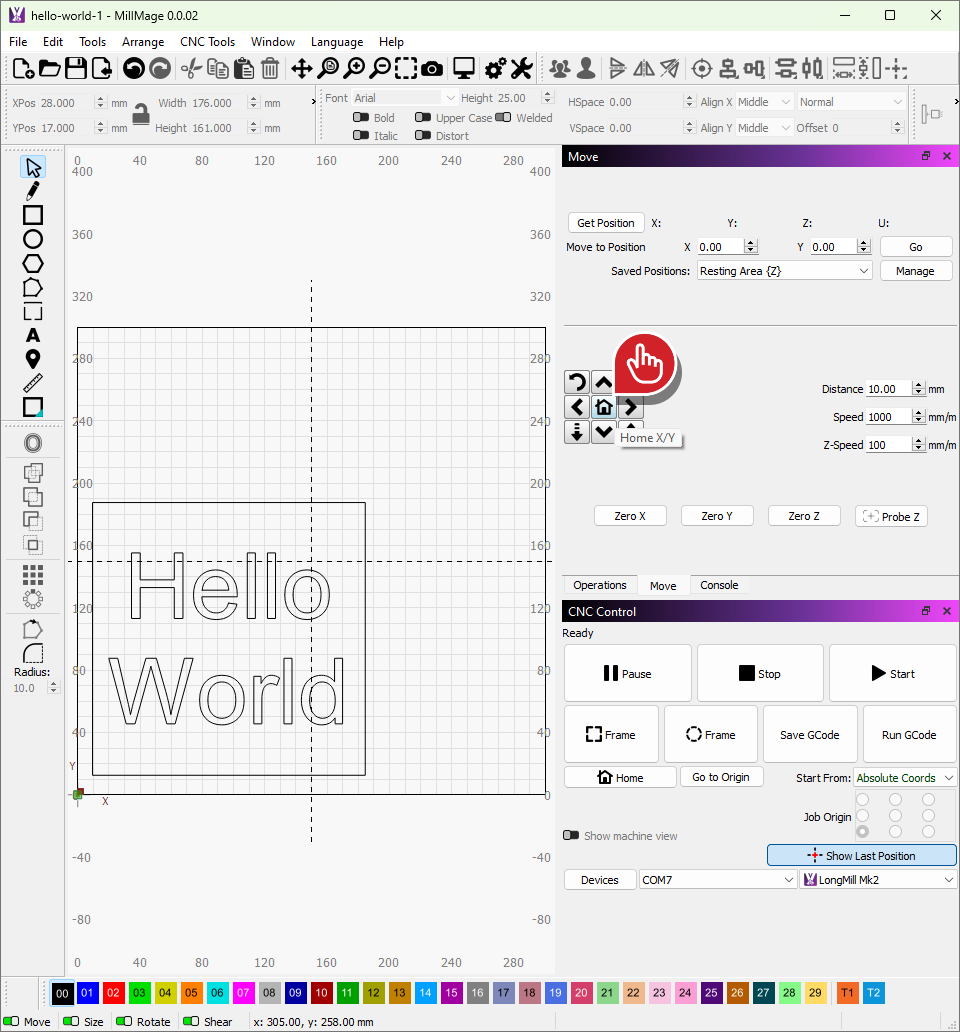Click on the Move tab to open the Move window. Home the CNC machine to establish machine zero (position 0.0 along the X, Y, and Z Axis) by pressing the