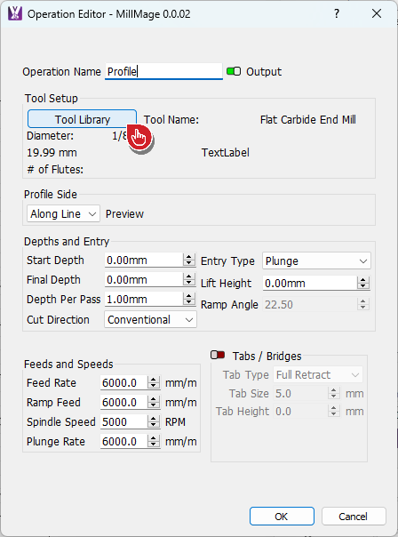 - Adding machined object retention Tabs to Profile operations that cut through the material stock