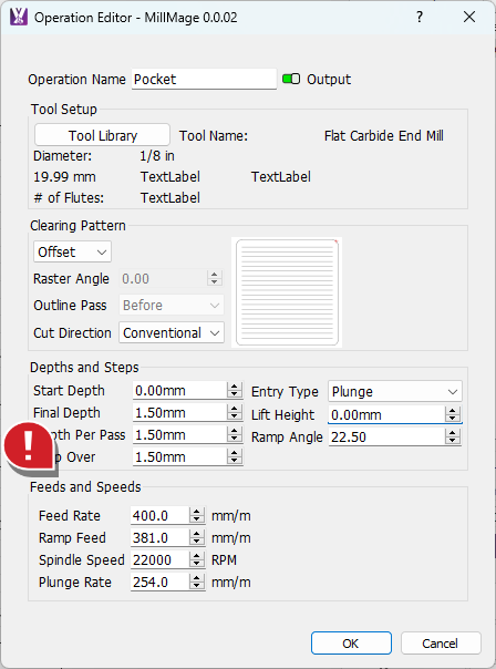 - Depth Per Pass: generally ½ the diameter of the tool, in this example 1.5 mm (1/16 in)