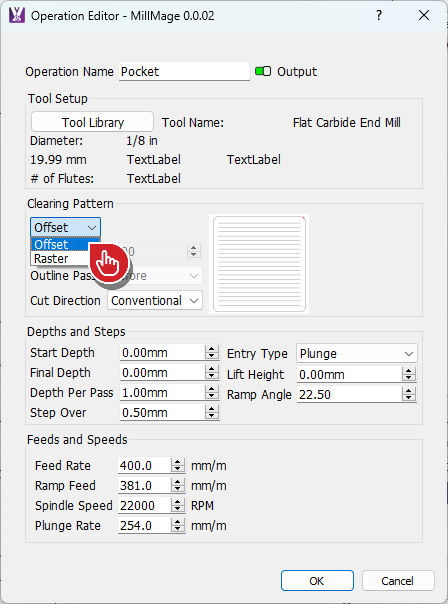 Set the Clearing Pattern dropdown to Offset, to make the router bit trace concentrically within the line paths of the text designs. Leave the Cut Direction set to Conventional — where the tooling pushes down on the material being cut.