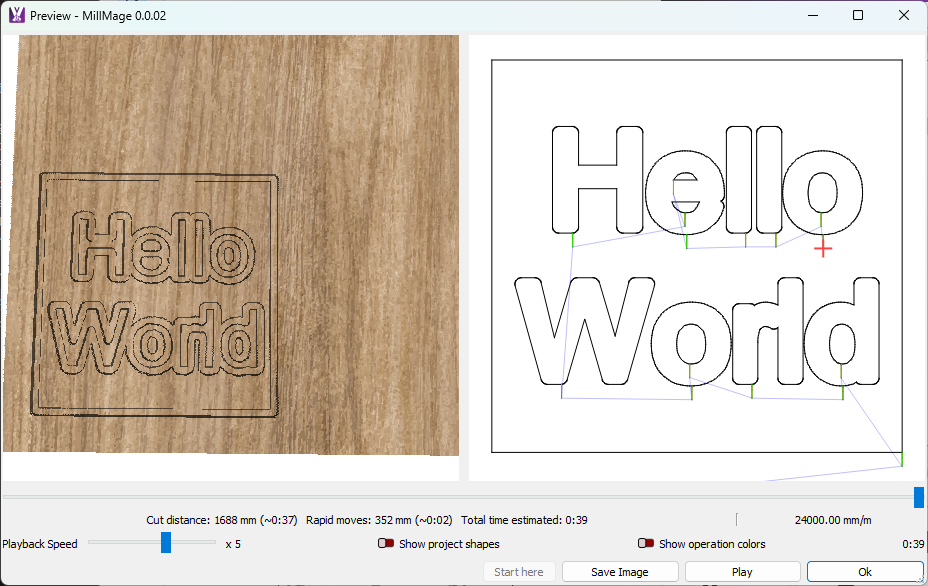 Press Play to view a real-time simulation of the upcoming operations. Optionally adjust the Playback Speed to increase or decrease the simulation speed.