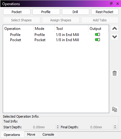 Select the Operations tab and verify the upcoming CNC operations by making sure each listed operation output is toggled on in the Operations window.