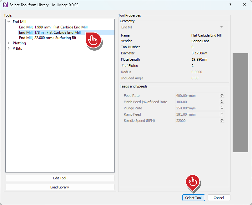 Press the Select Tool button and choose a beginner-friendly tool like an ⅛" or ¼" flat end mill. A tooling preview will be displayed in the right-hand side of the Select Tool from Library window. Review & verify the tooling specifications in the Tool Properties. Refer to the router bit manufacturer for specific tooling details. Learn how to add tooling in the Add Tooling guide.