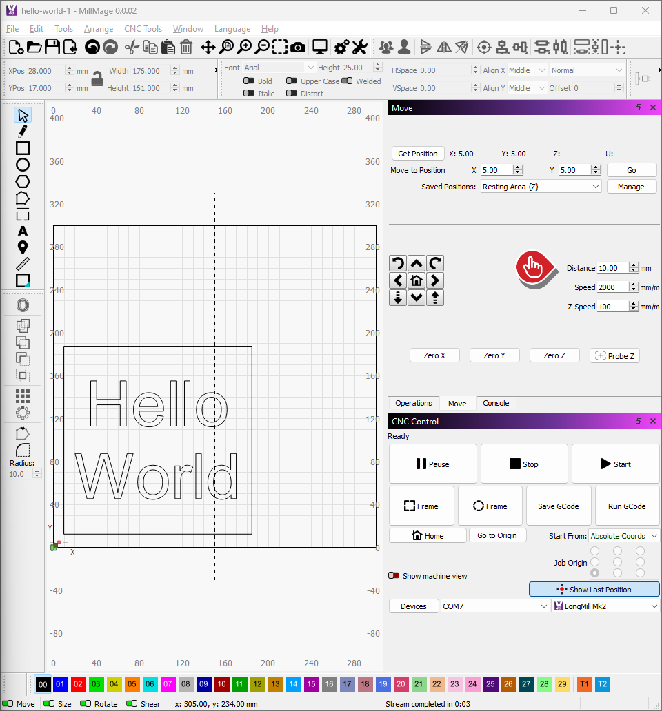 Open a connection to the device, by selecting the proper COM port in the CNC Control window. The CNC Control window will display "Connected" when communication with the CNC machine has been established.