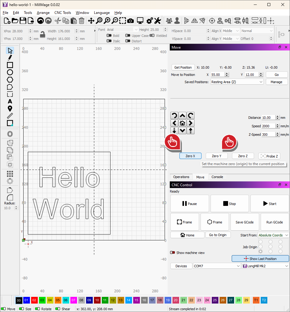 Click on the Zero X and Zero Y buttons once satisfied with the placement of the tooling over the front left-hand corner of the workpiece to set the machine coordinates to 0.0 along the X, and Y axis.
