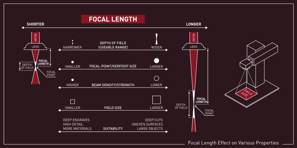 Focal length affects the strength and size of the laser dot where it meets the material. A laser that is perfectly focused will have the smallest dot possible, with the highest strength of the beam.